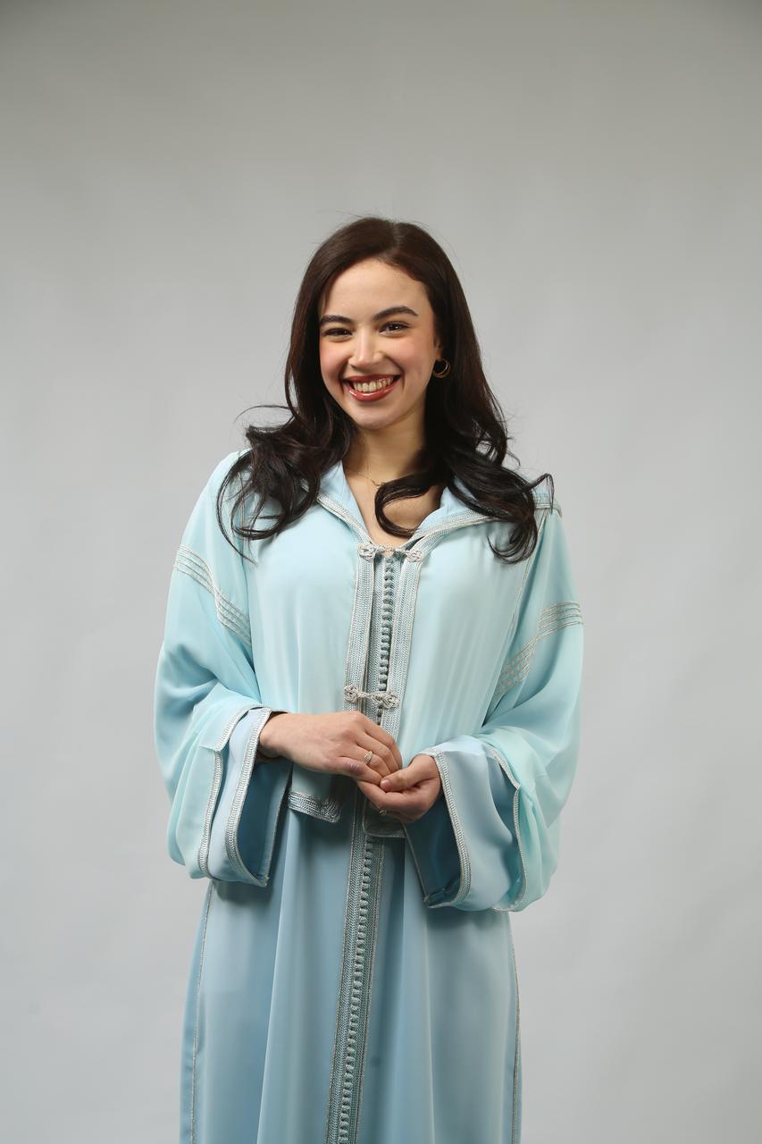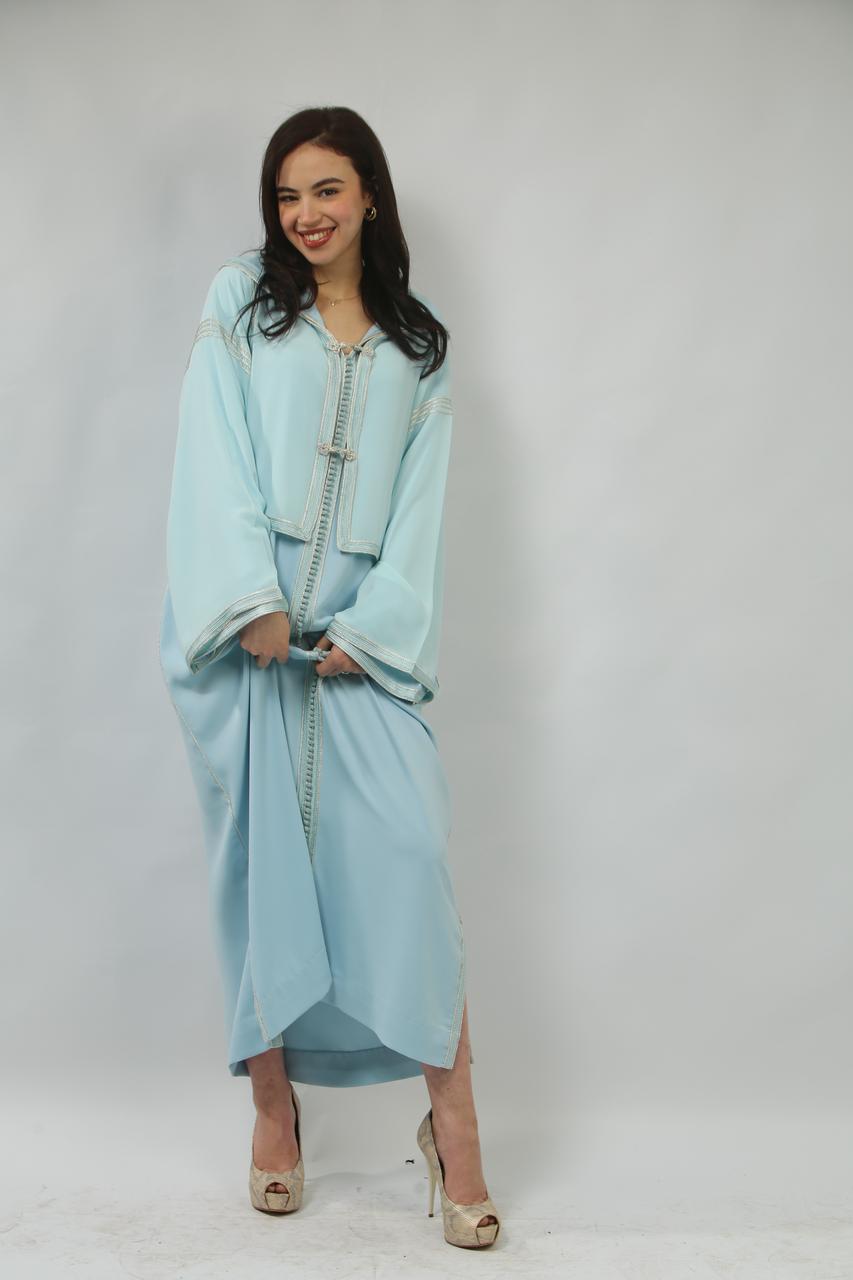 Ce caftan se compose de deux pièces distinctes, mettant en avant un tissu yakout richement travaillé. La pièce principale est agrémentée d'un gilet traditionnel en crêpe georgette fluide, qui confère une légèreté et une élégance à l'ensemble.