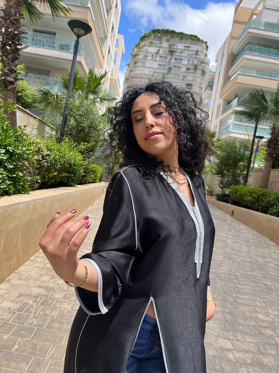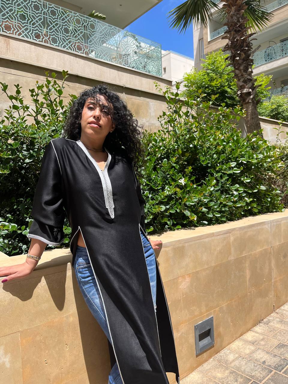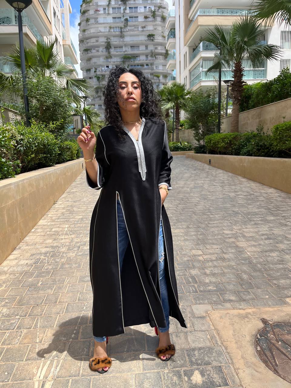 La particularité de ce caftan réside dans ses fentes discrètes sur les côtés, offrant une touche de modernité et de dynamisme à la pièce. Ces fentes latérales permettent une liberté de mouvement tout en révélant subtilement les jambes lors de la marche, apportant une note de sensualité subtile.