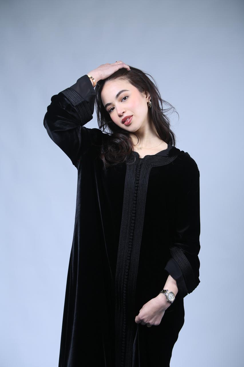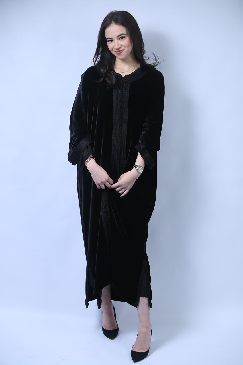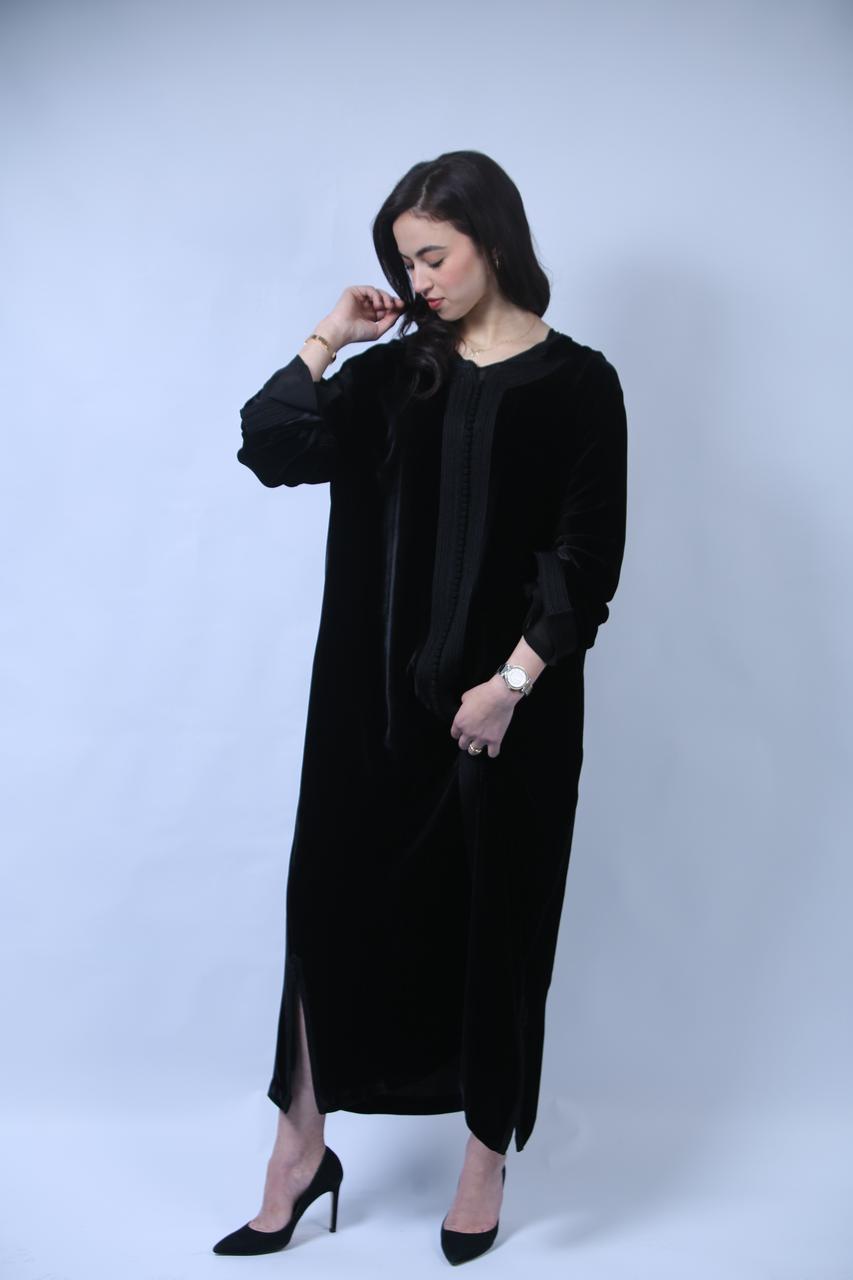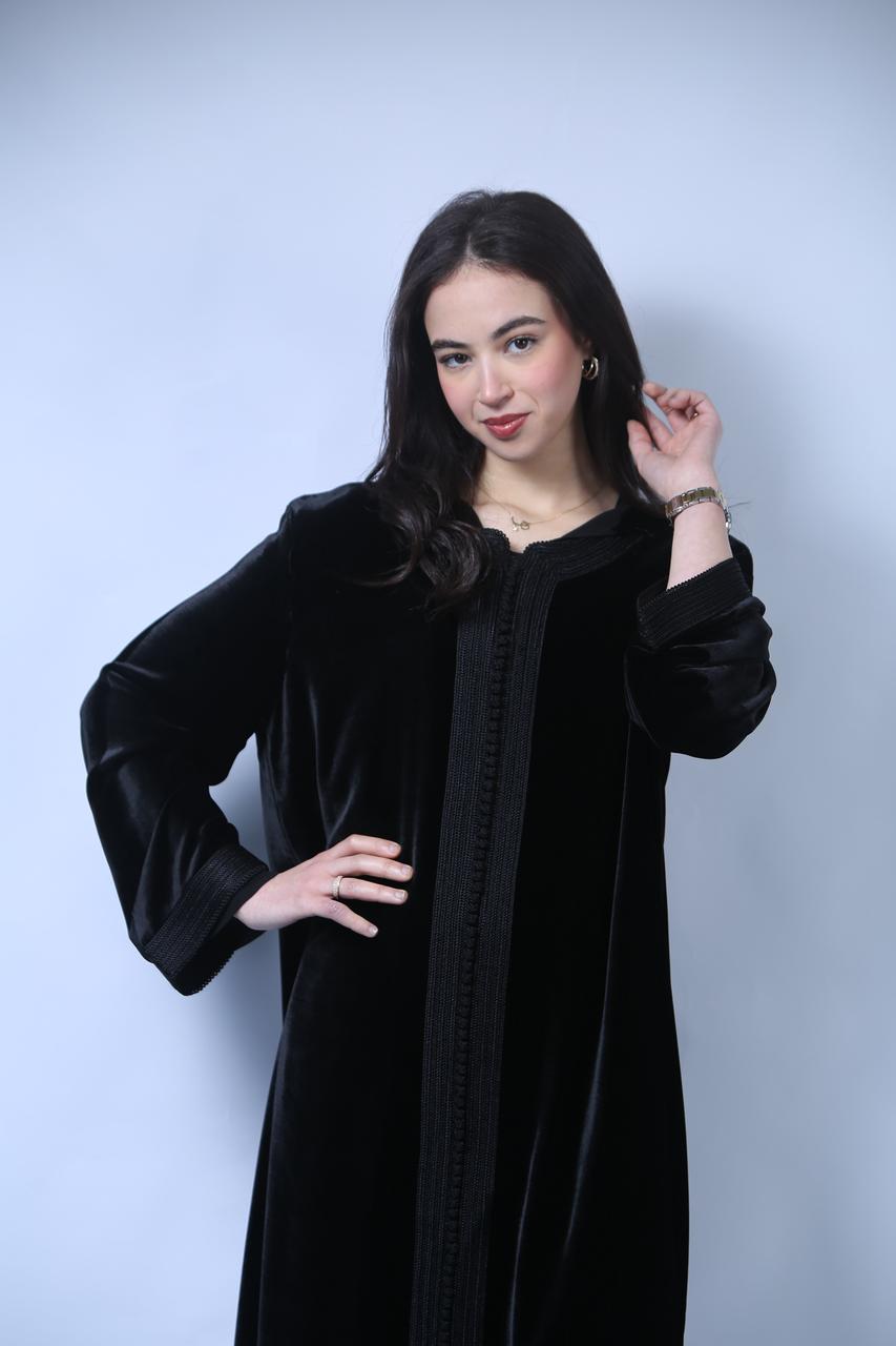 Chic et Sophistiquée : Jellaba en Velours Noir aux Finitions Précieuses