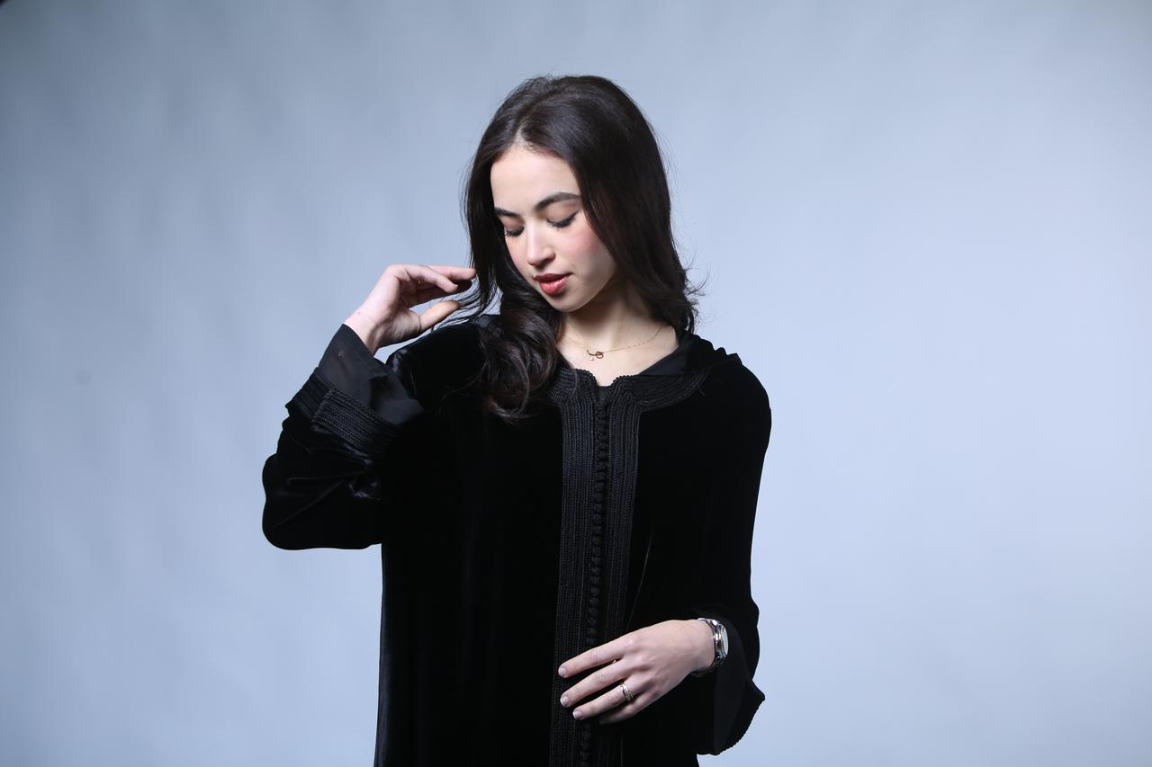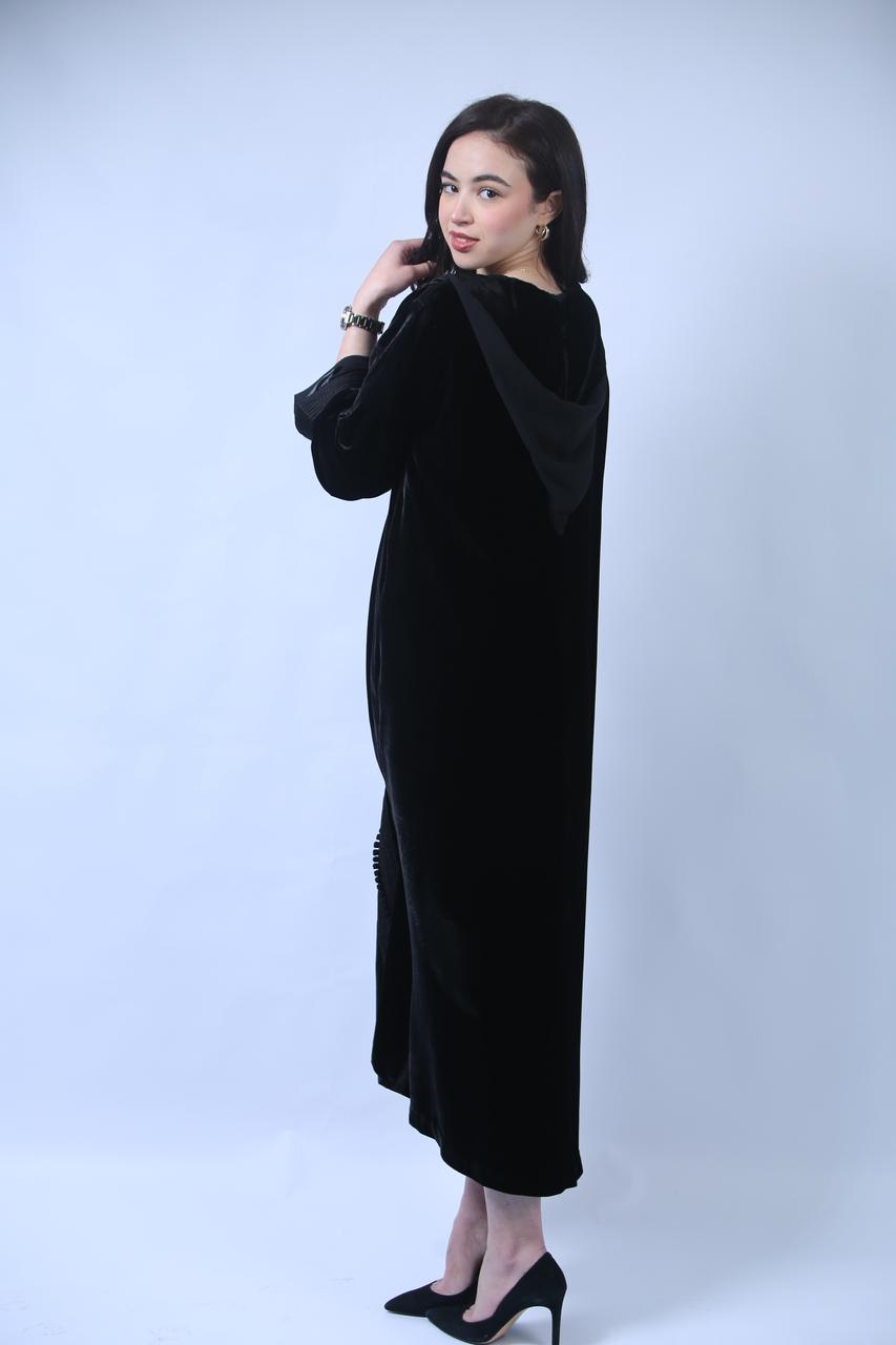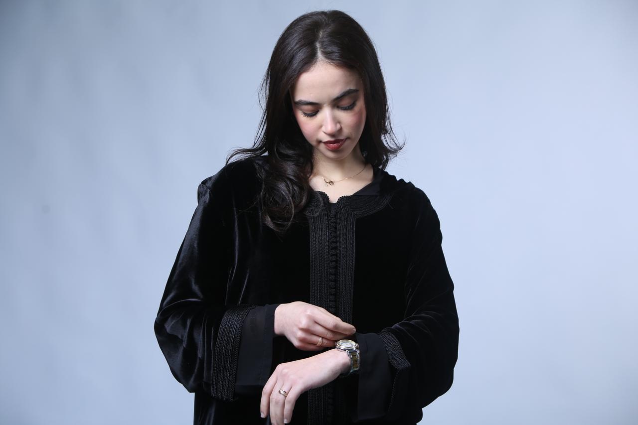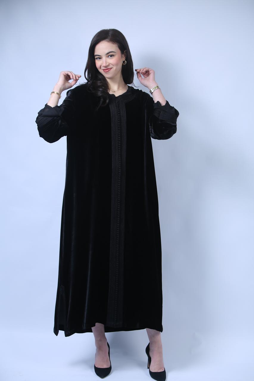 Chic et Sophistiquée : Jellaba en Velours Noir aux Finitions Précieuses
