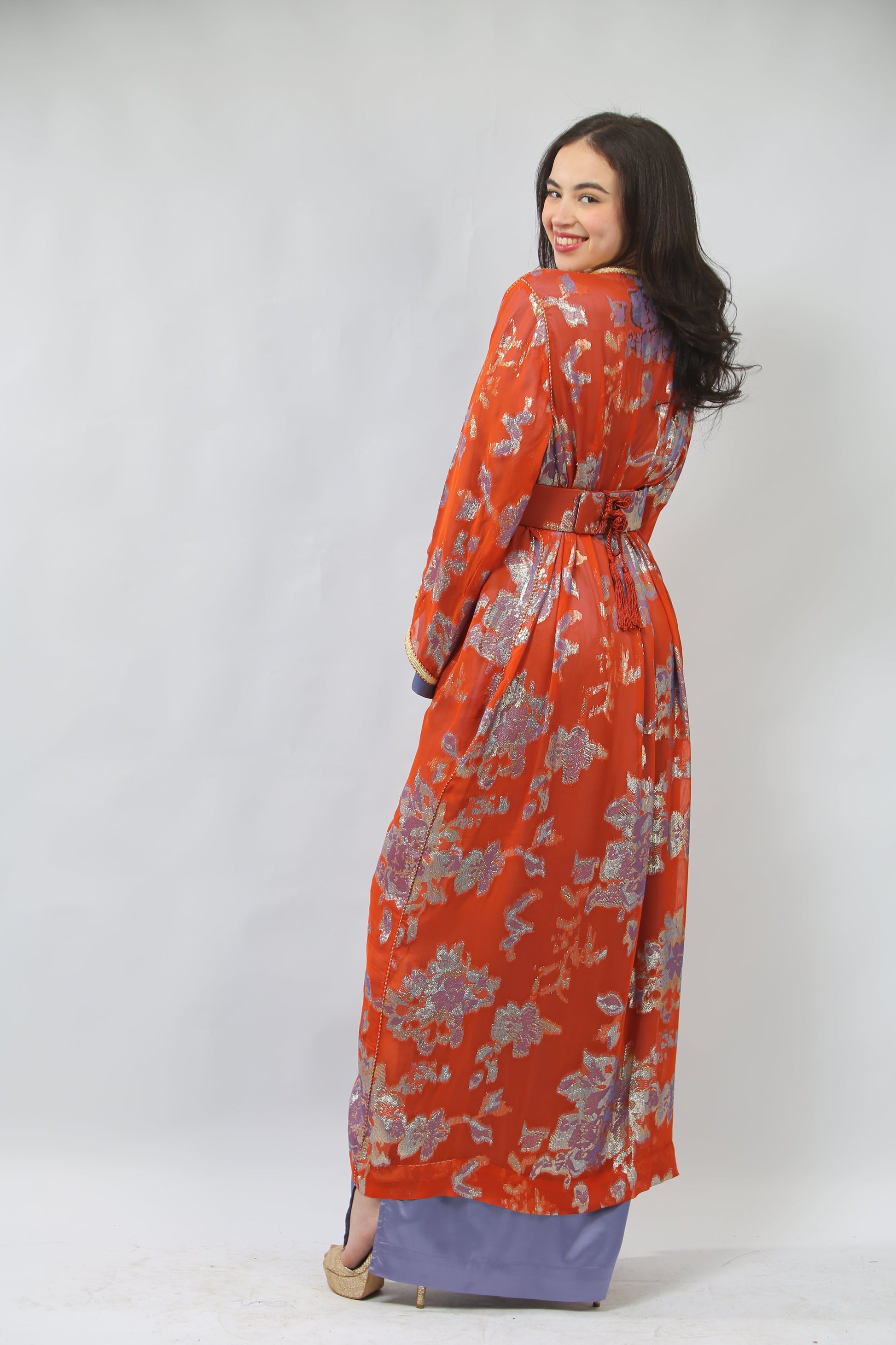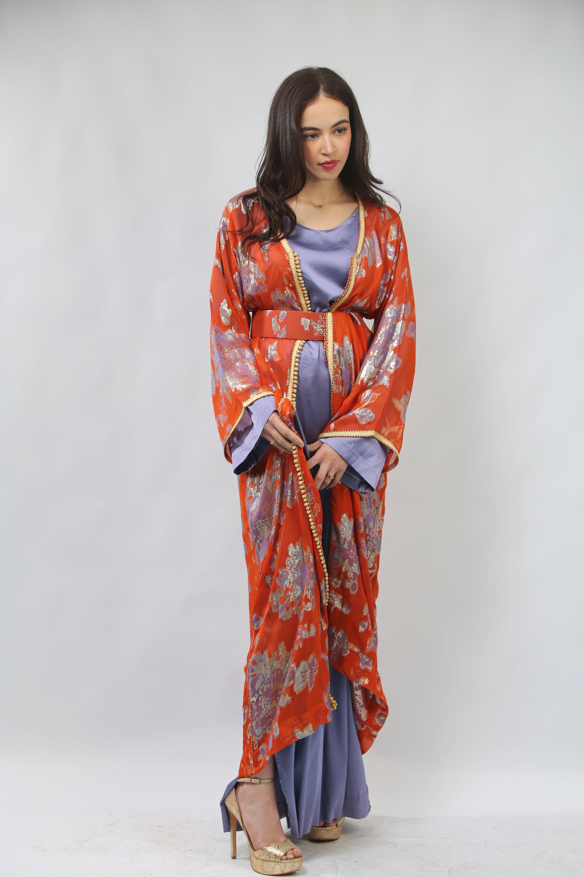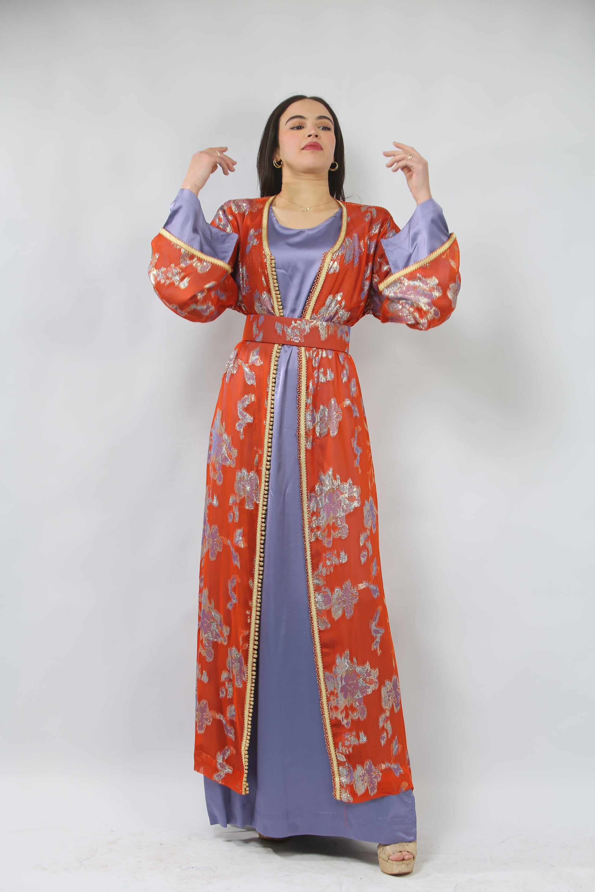 Cet ensemble caftan est à la fois chic et audacieux. La pièce intérieure est une robe en satin violet, fluide et élégante, dotée de longues fentes sur les côtés qui ajoutent une touche de sensualité et de mouvement. Par-dessus, un caftan en tissu tlija, richement travaillé, se déploie avec splendeur. Il est orné de broderies « sfifa » et « aaqd » en fil d'or, créant un contraste éblouissant avec le violet de la robe. Une ceinture délicate souligne la taille, ajoutant une touche de définition à la silhouette. Les couleurs chaudes et les détails raffinés font de cet ensemble un choix parfait pour une occasion festive, alliant tradition et modernité avec grâce.