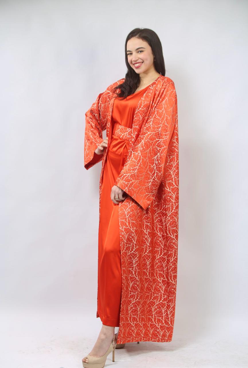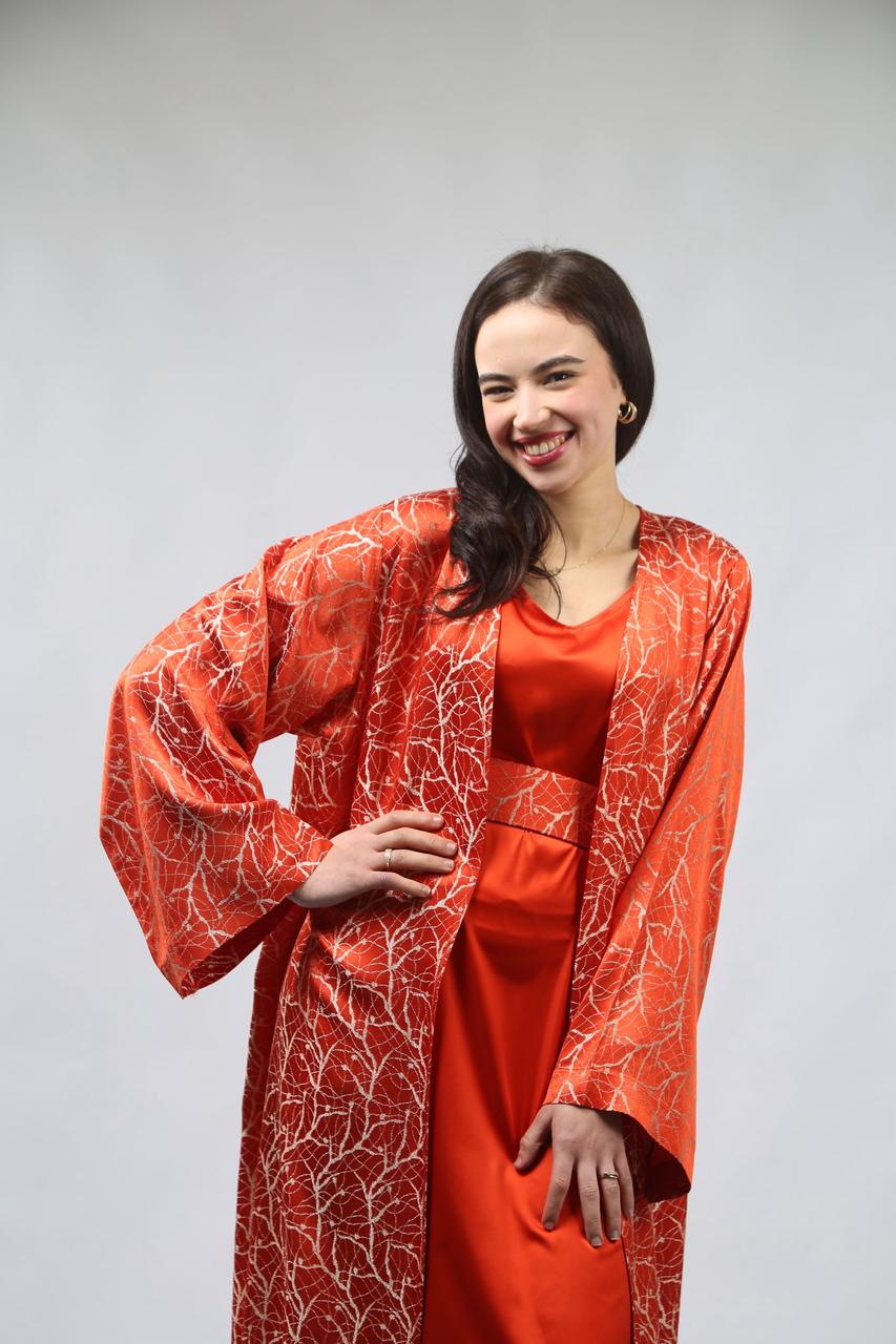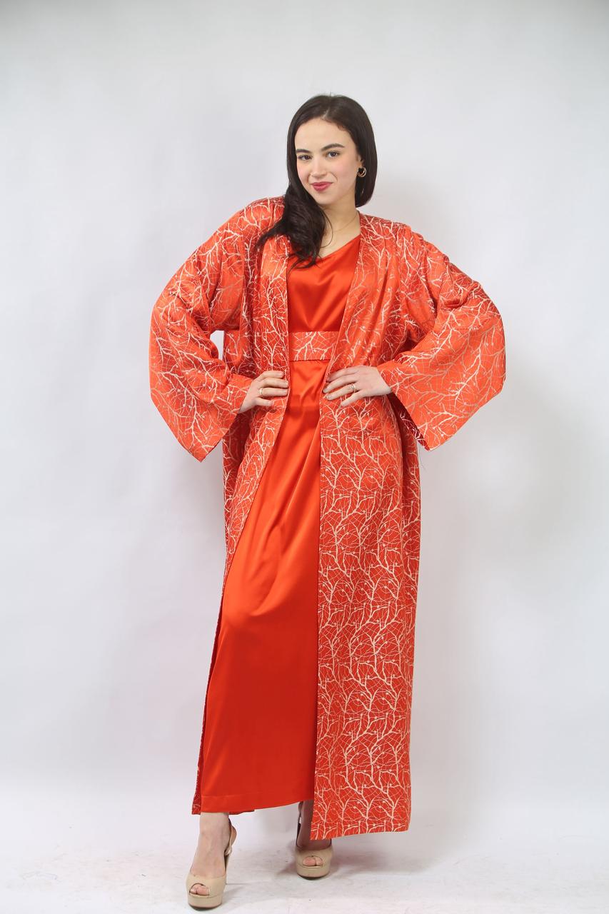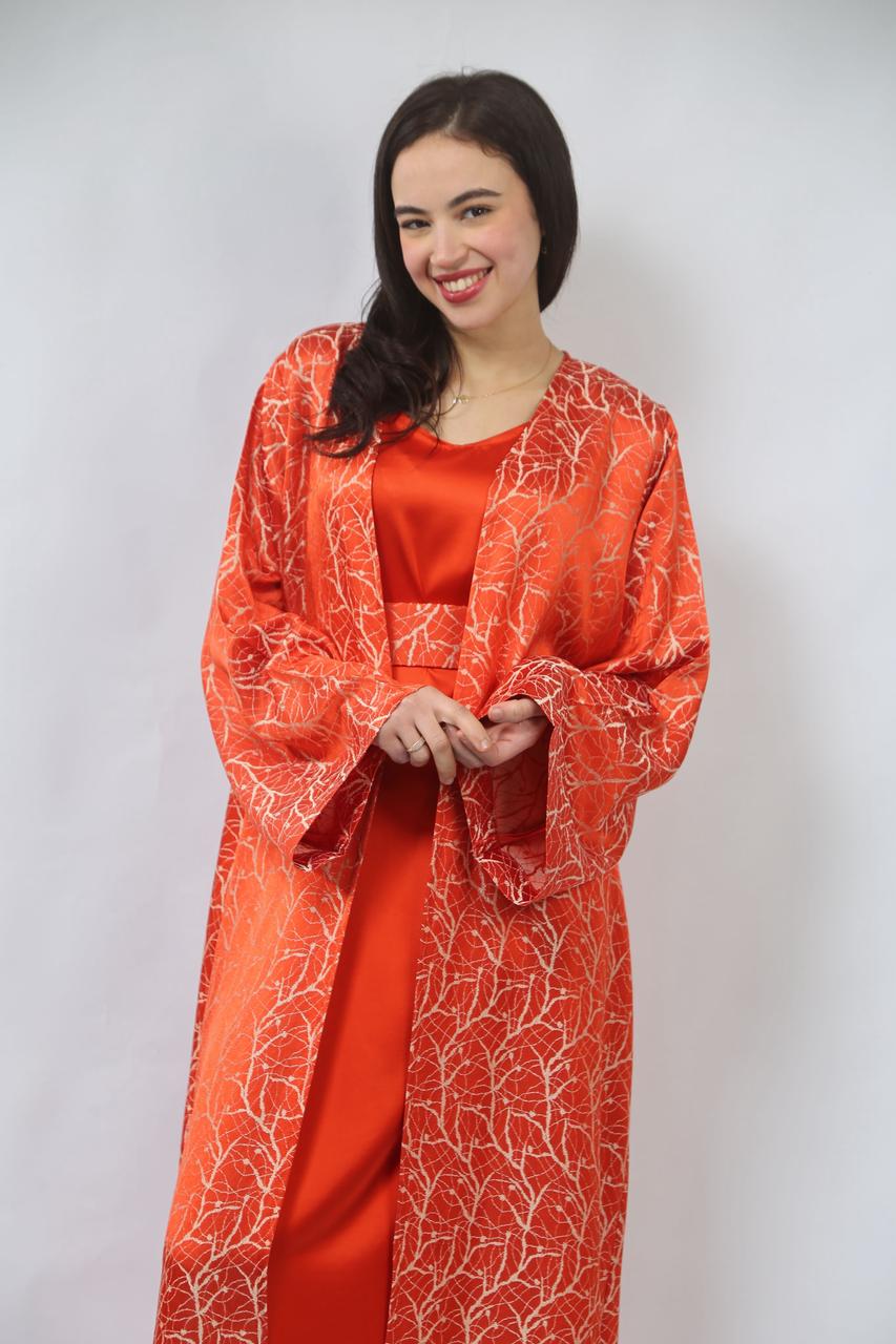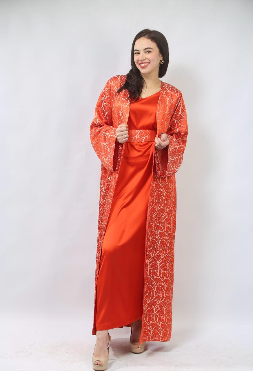 La première pièce, la robe sans manches en satin rouge brique, est à la fois élégante et confortable. Sa coupe fluide met en valeur la silhouette tout en offrant une allure chic. La ceinture traditionnelle accentue la taille, ajoutant une touche de sophistication et d'harmonie à l'ensemble.
