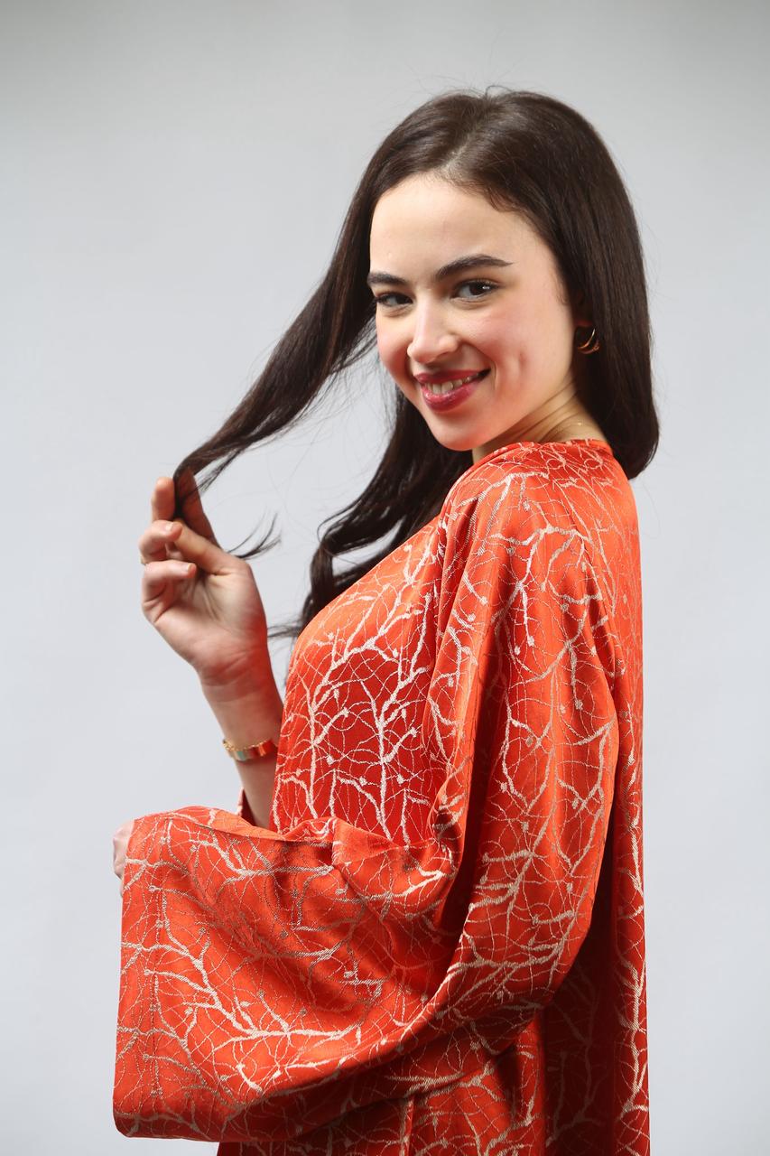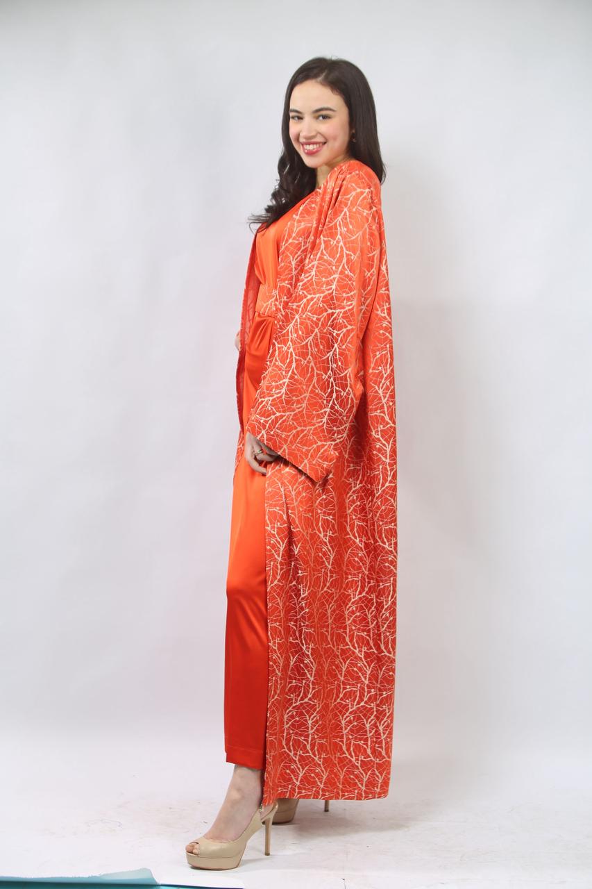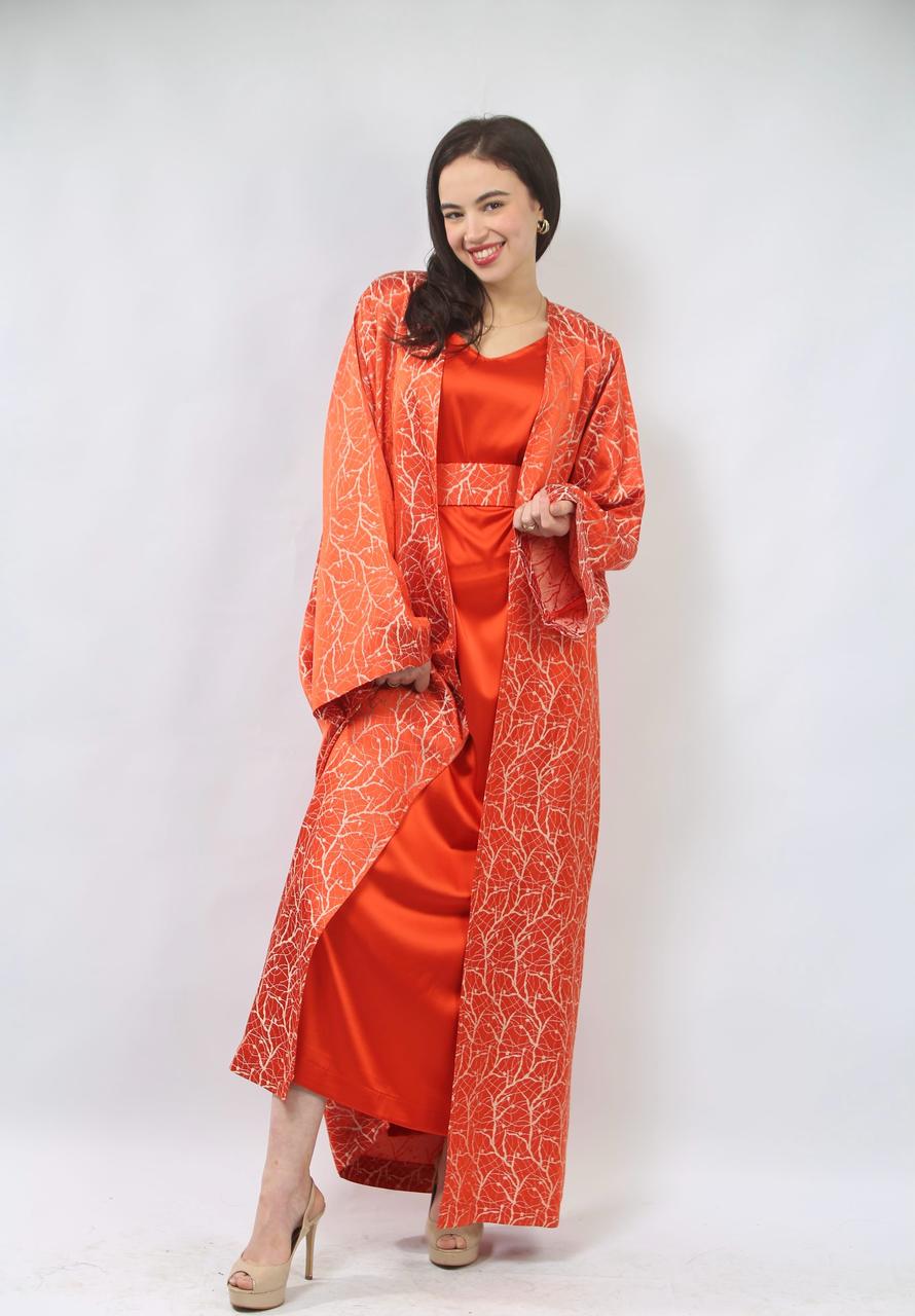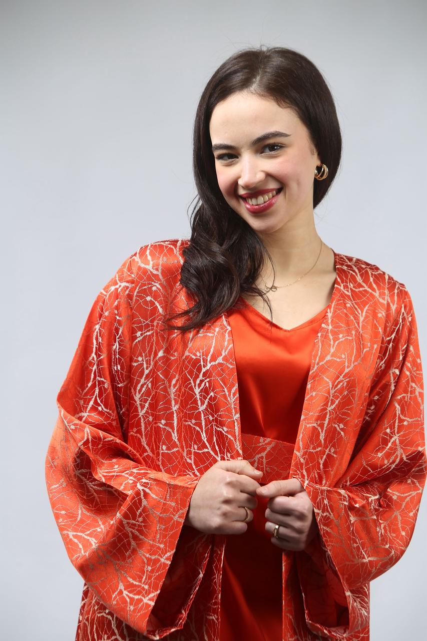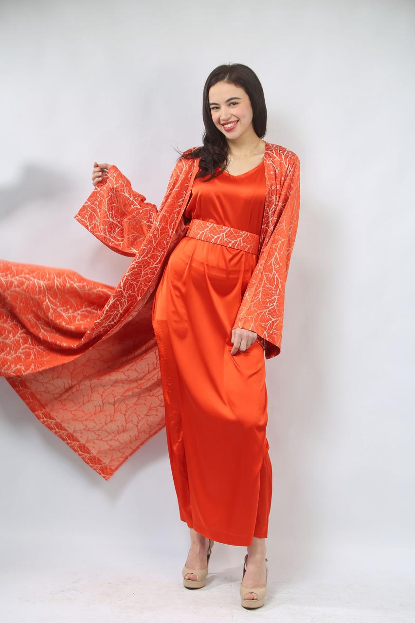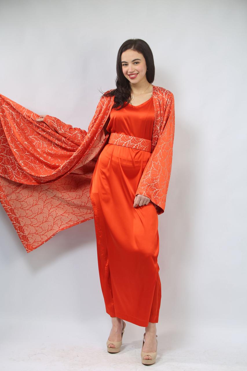 La première pièce, la robe sans manches en satin rouge brique, est à la fois élégante et confortable. Sa coupe fluide met en valeur la silhouette tout en offrant une allure chic. La ceinture traditionnelle accentue la taille, ajoutant une touche de sophistication et d'harmonie à l'ensemble.
