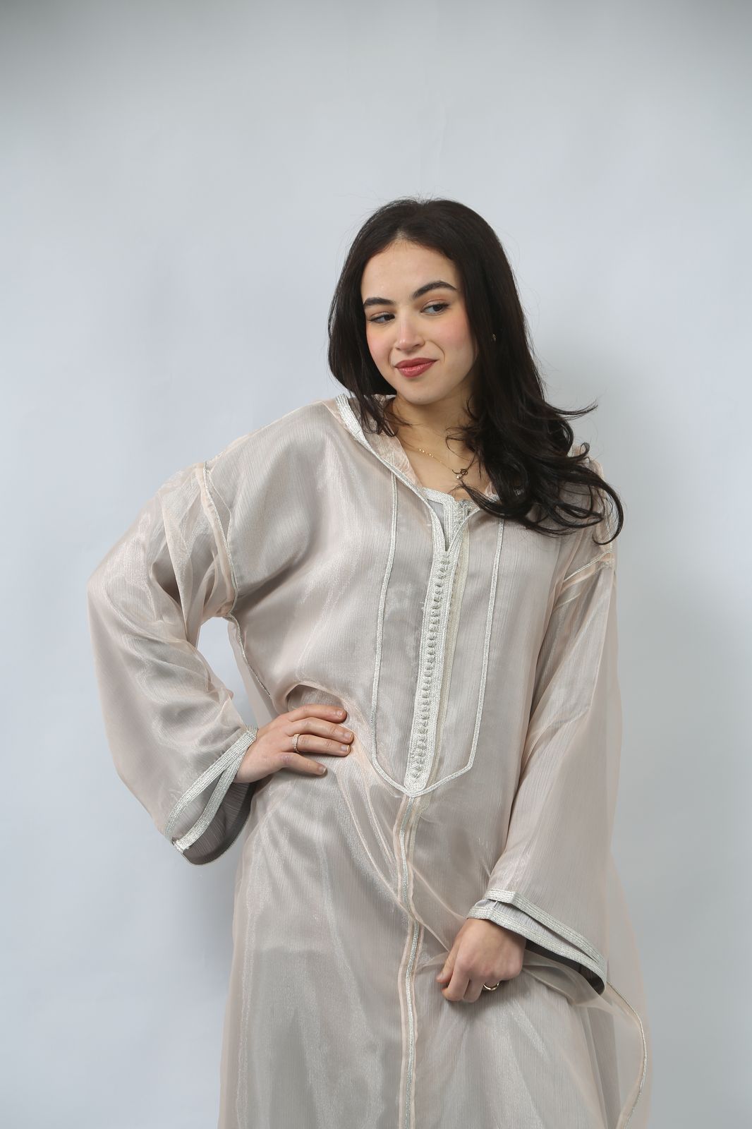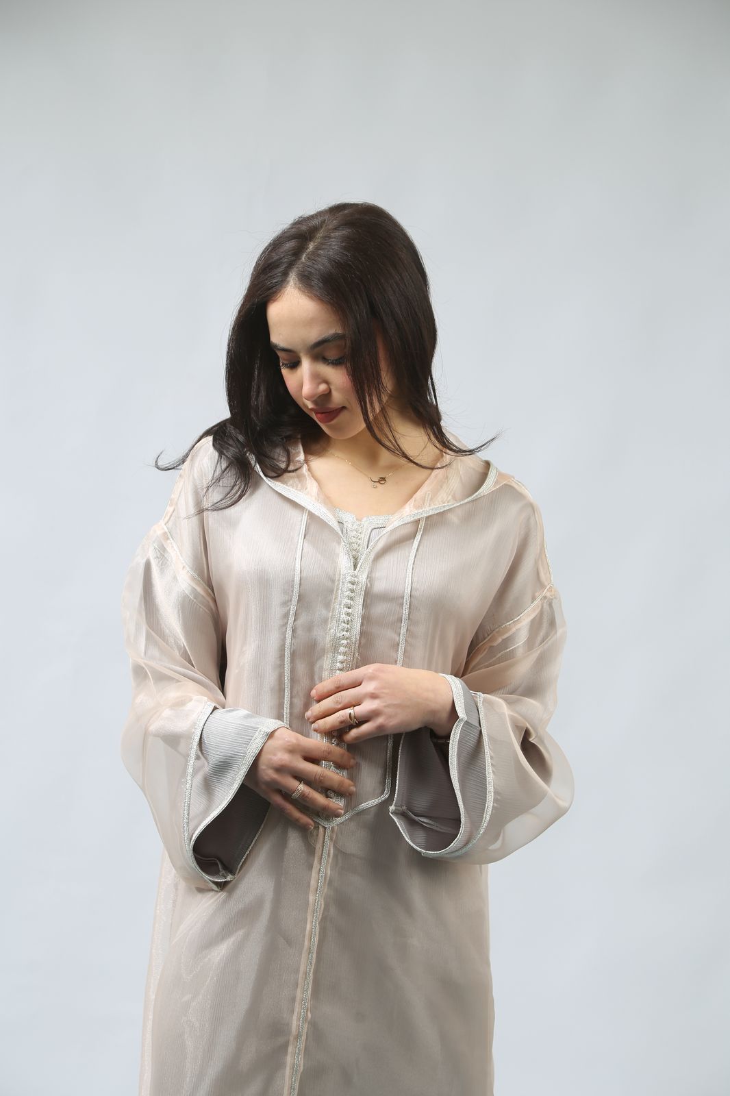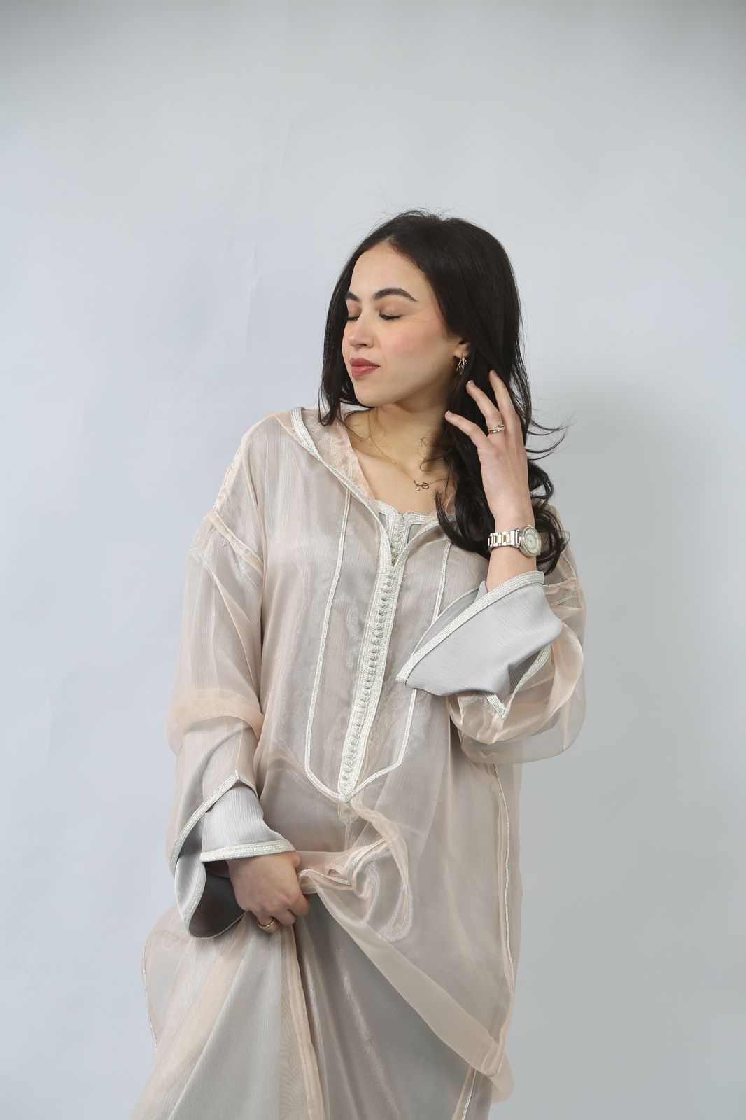 Cette jellaba à deux pièces en organza saumon est une véritable œuvre d'art. Sa teinte douce et délicate évoque la douceur d’un lever de soleil, tandis que le travail raffiné en "aaqad quitane" avec du fil argenté ajoute une touche d’éclat et de sophistication.