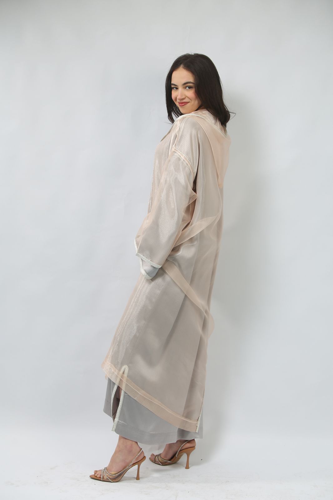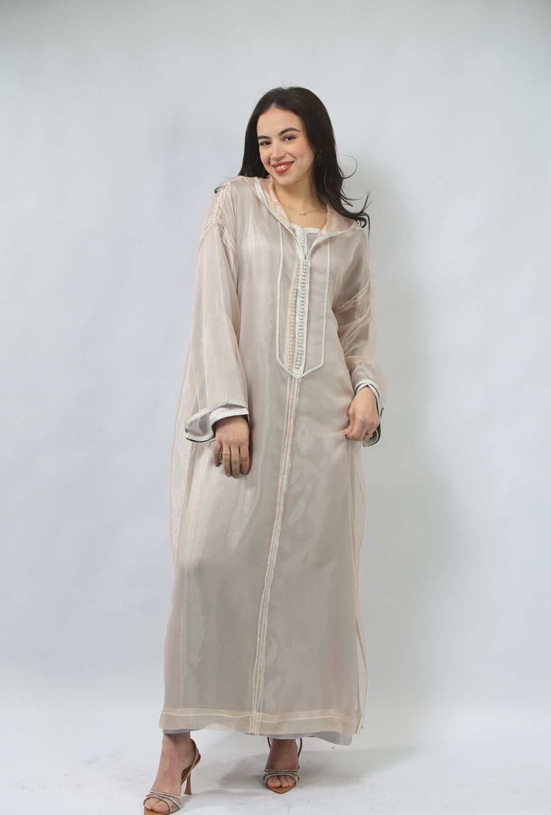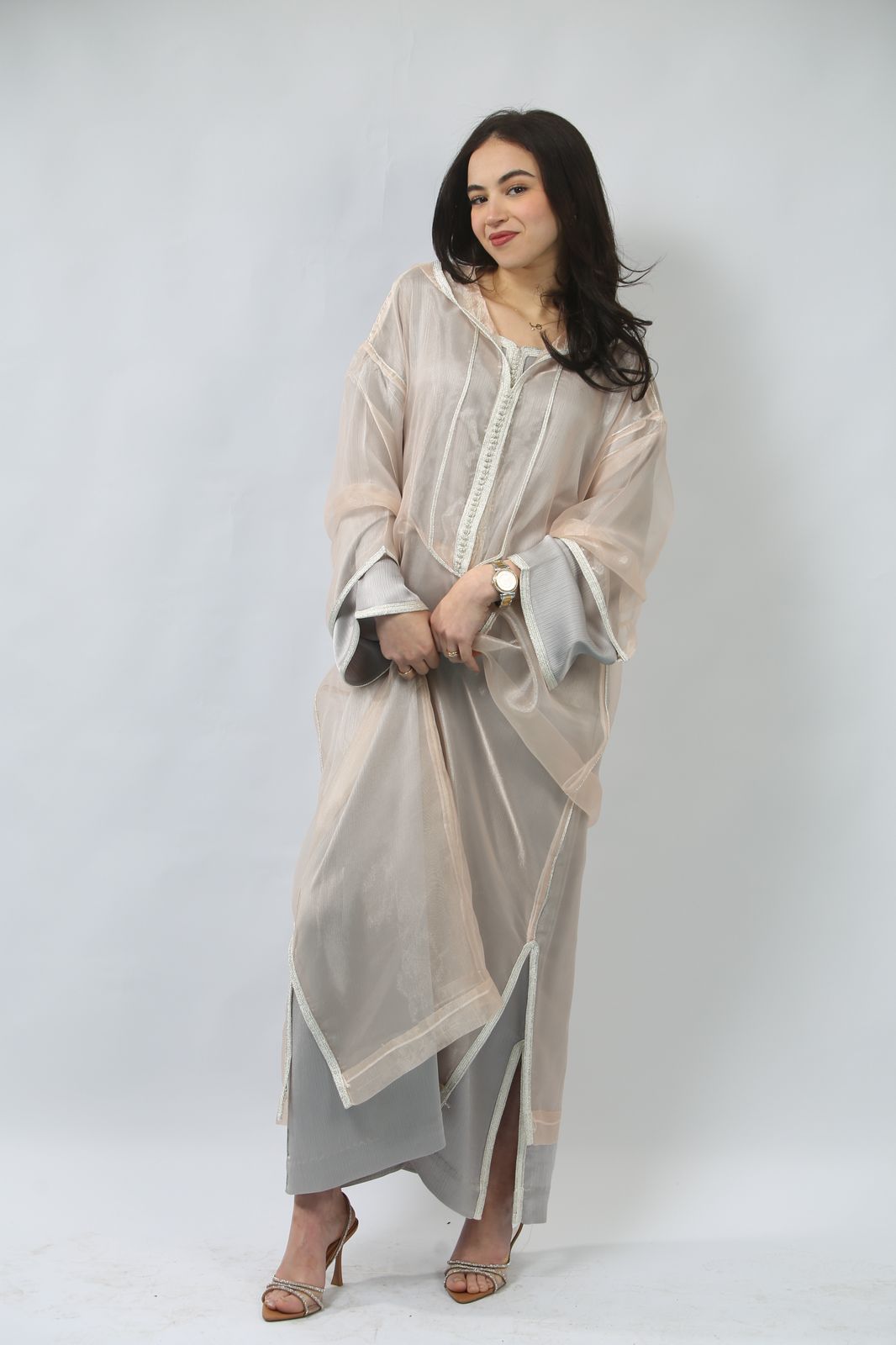 Cette jellaba à deux pièces en organza saumon est une véritable œuvre d'art. Sa teinte douce et délicate évoque la douceur d’un lever de soleil, tandis que le travail raffiné en "aaqad quitane" avec du fil argenté ajoute une touche d’éclat et de sophistication.