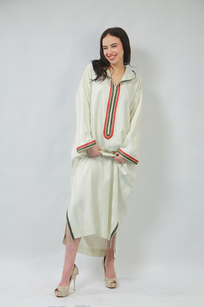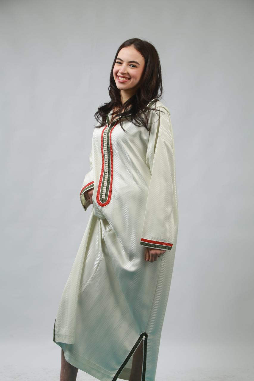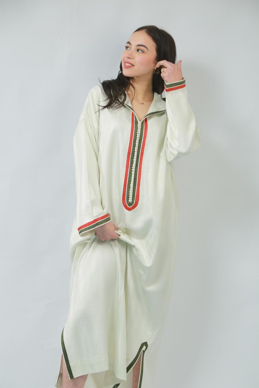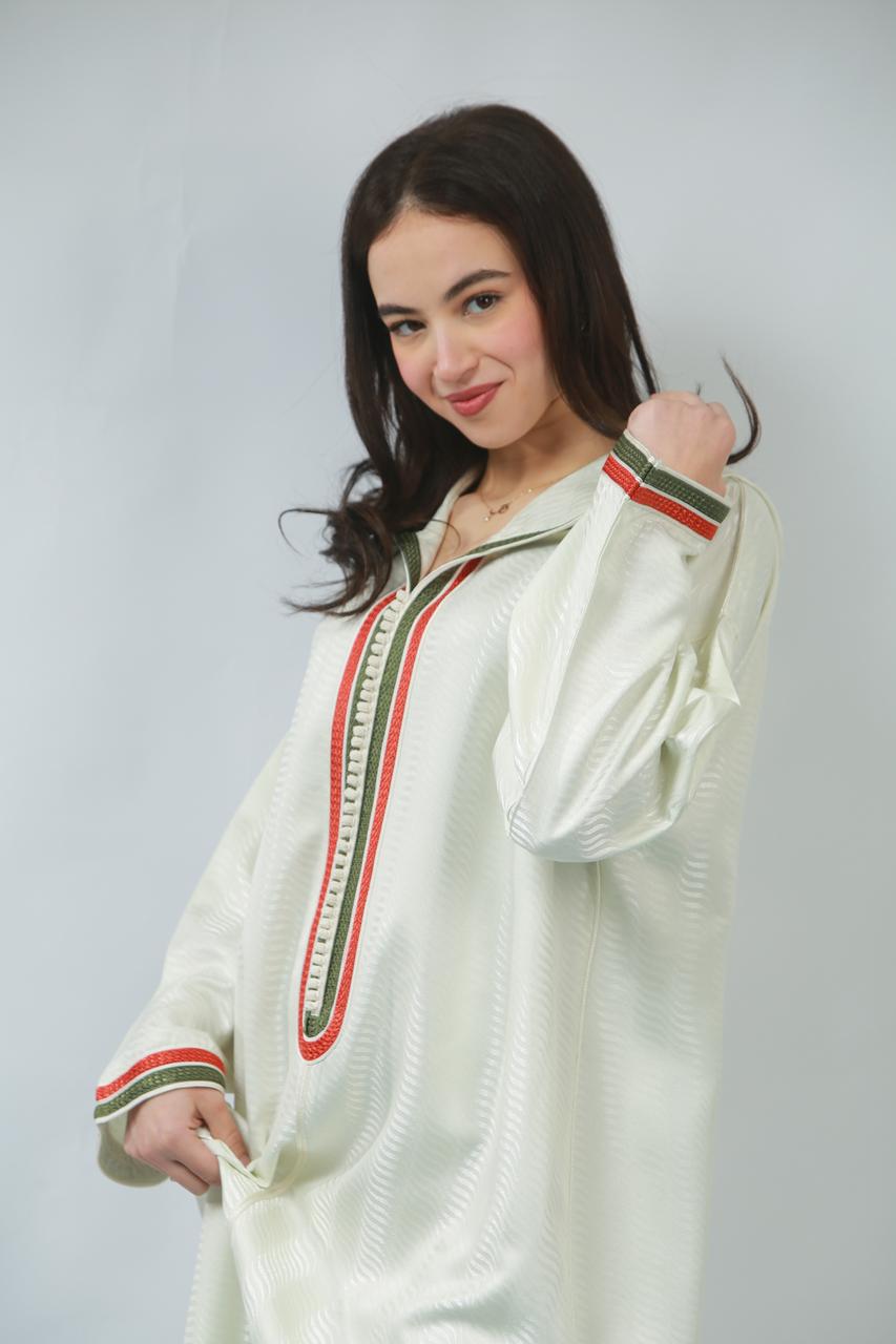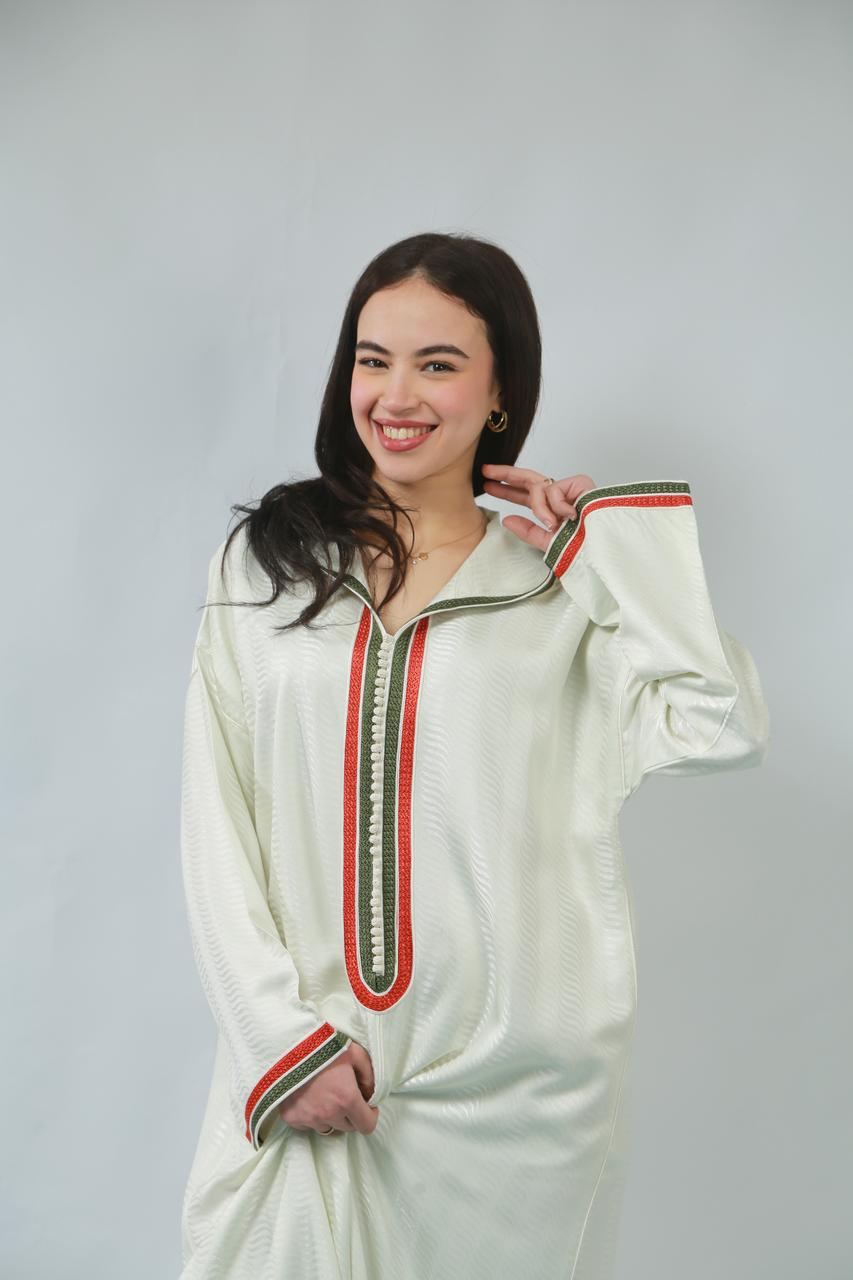 Le col délicat souligne le cou avec grâce, tandis que la coupe fluide de la jellaba épousera les formes avec élégance, offrant un mouvement sensuel à chaque pas. Cette pièce, à la fois traditionnelle et contemporaine, incarne un charme irrésistible, parfaite pour faire tourner les têtes lors d'occasions spéciales.