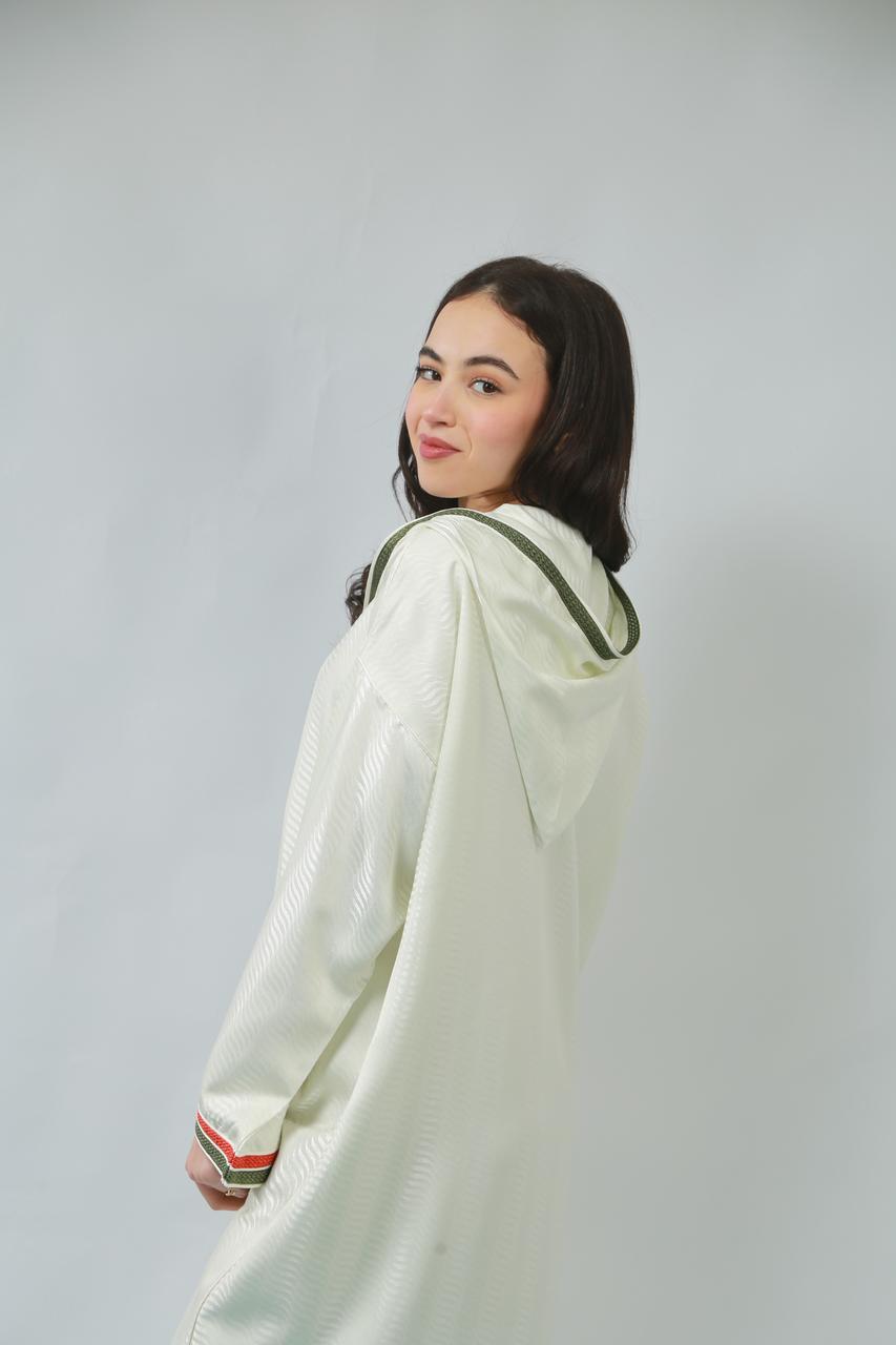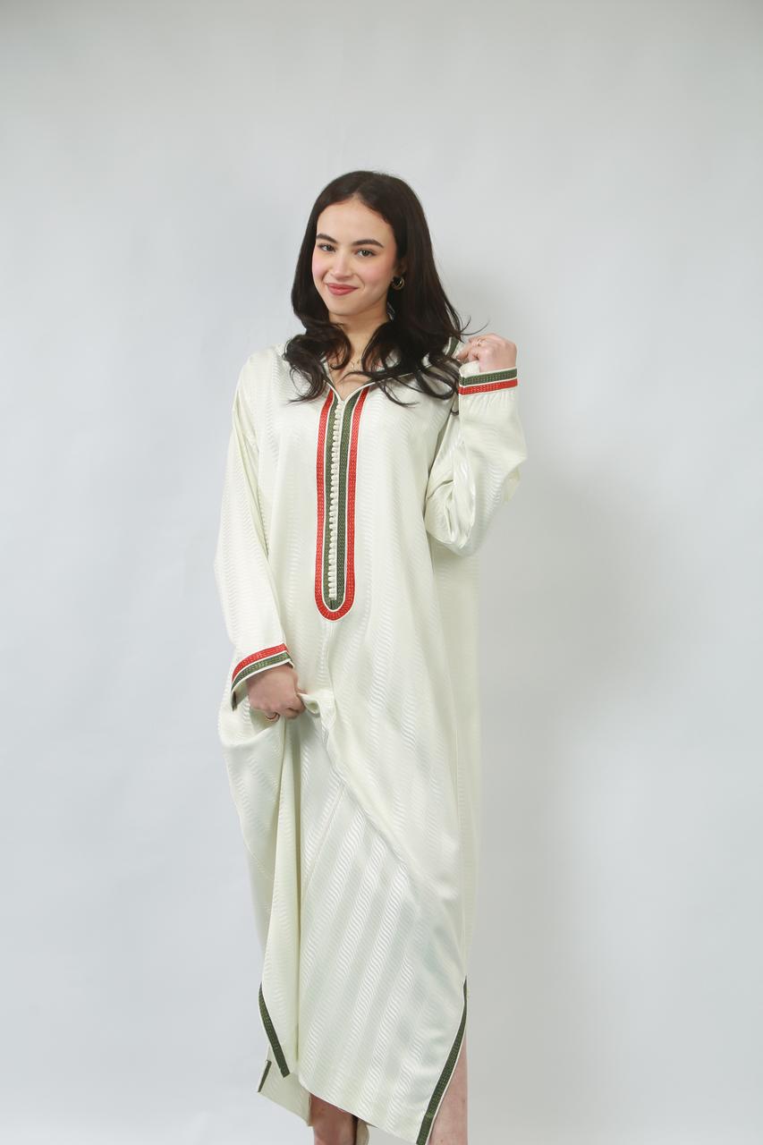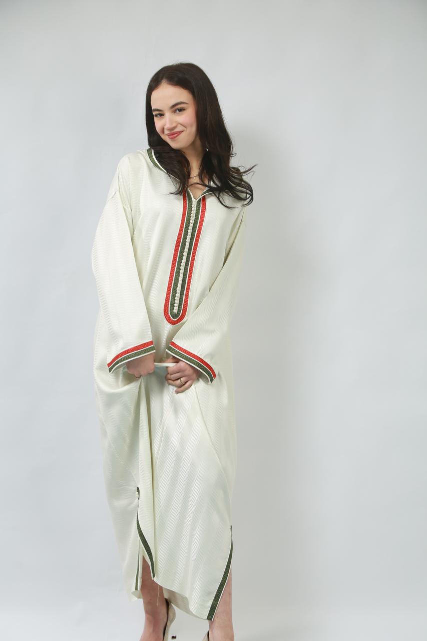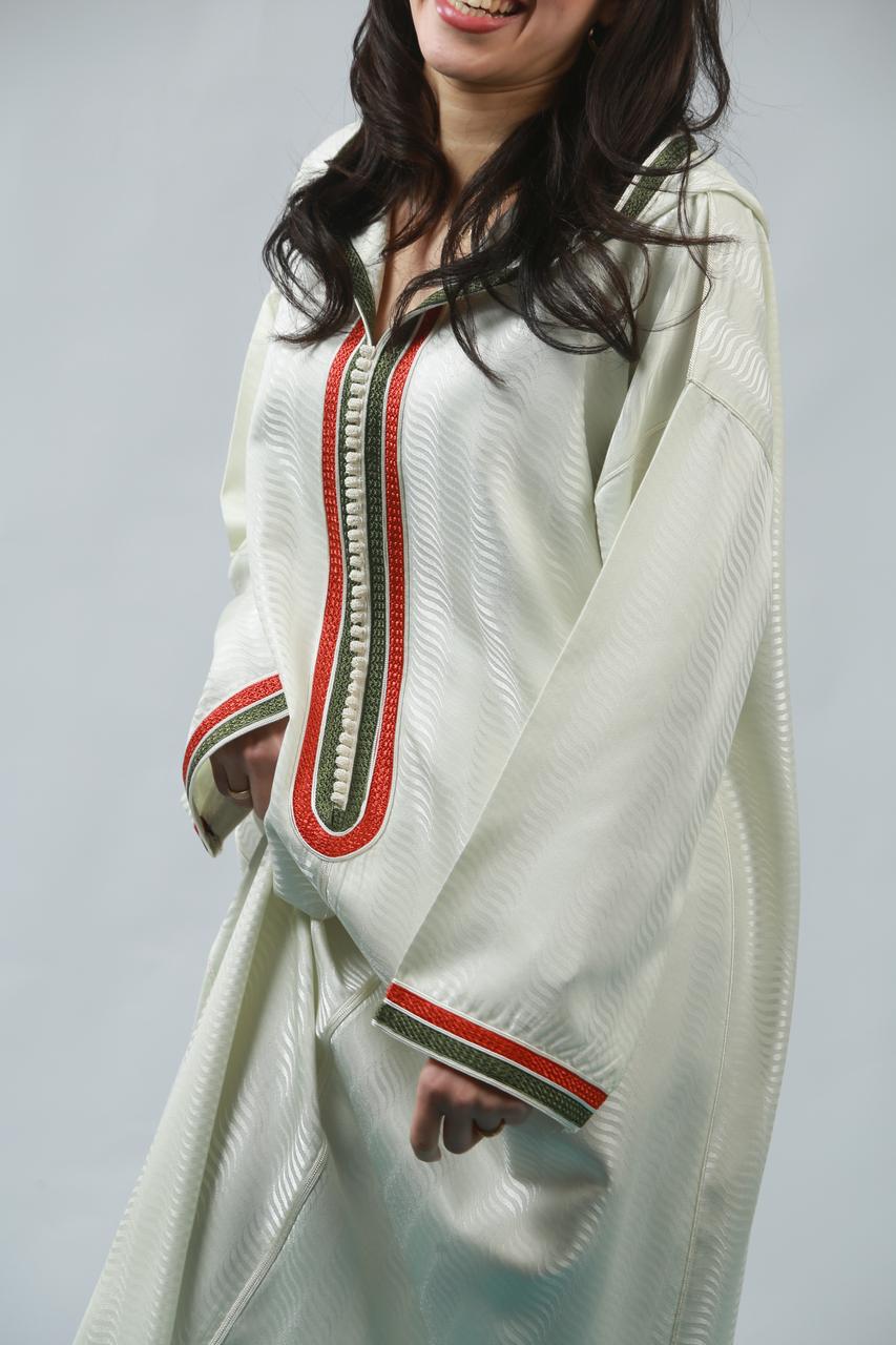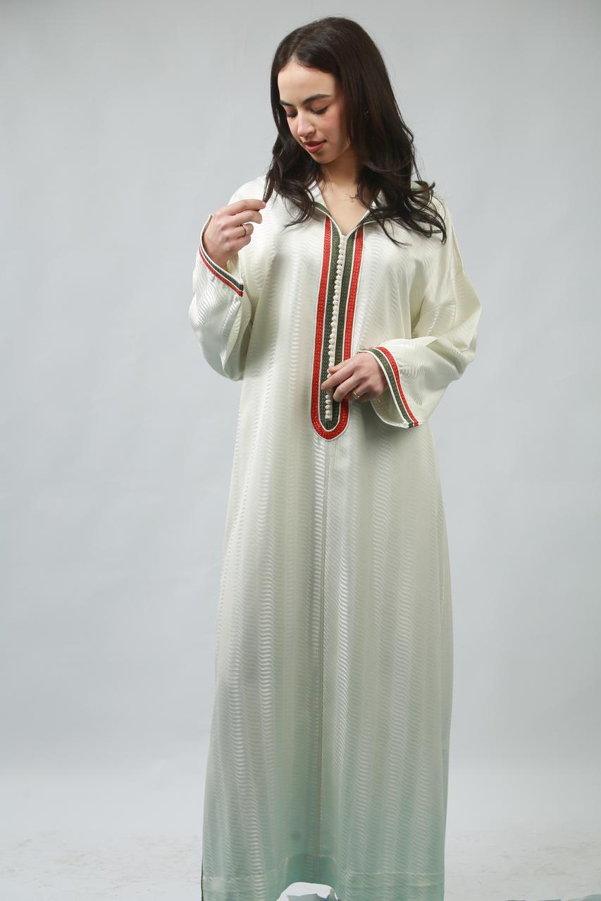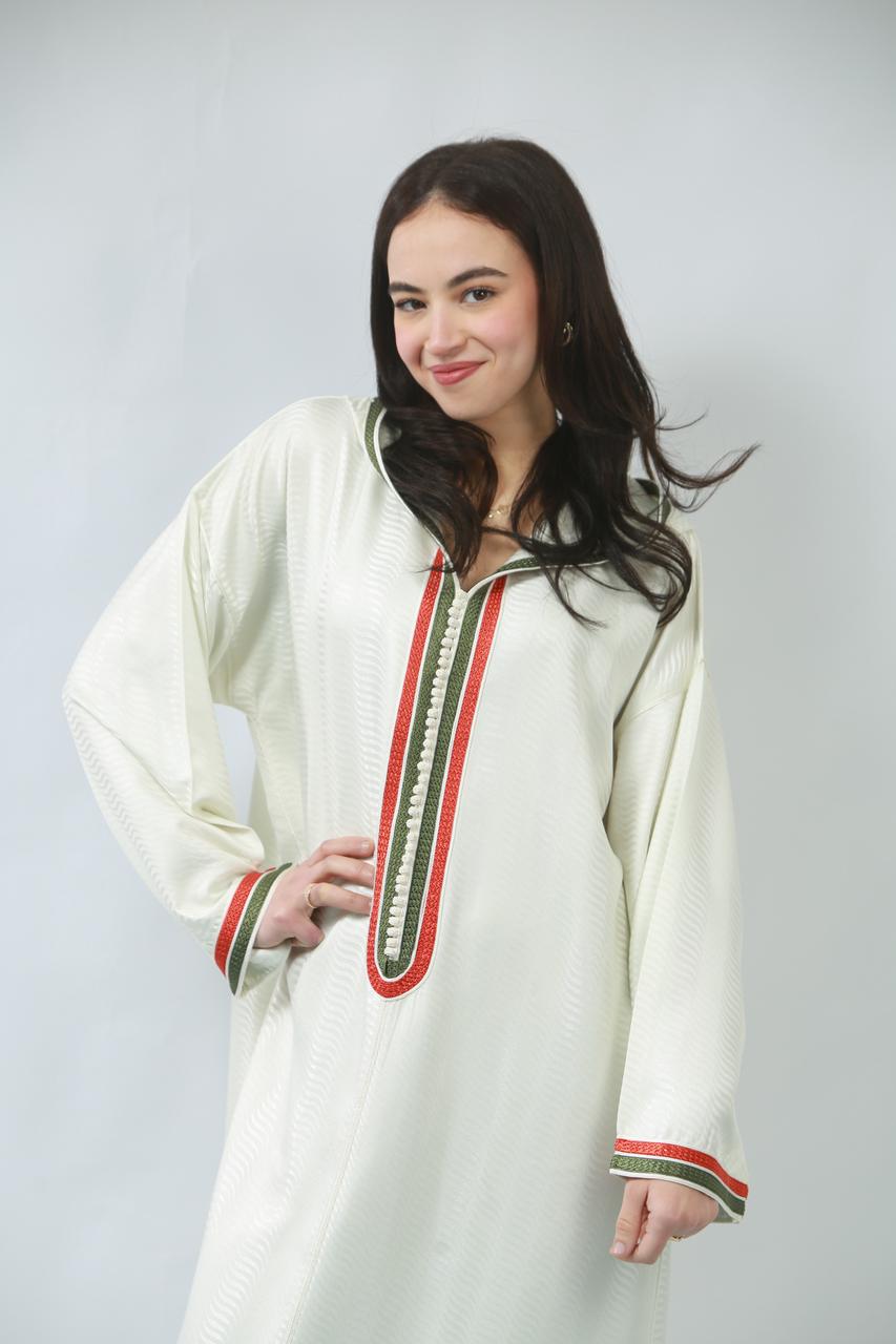 Le col délicat souligne le cou avec grâce, tandis que la coupe fluide de la jellaba épousera les formes avec élégance, offrant un mouvement sensuel à chaque pas. Cette pièce, à la fois traditionnelle et contemporaine, incarne un charme irrésistible, parfaite pour faire tourner les têtes lors d'occasions spéciales.